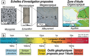 La craie du Bassin de Paris est caractérisée par une forte porosité et une épaisseur importante. La compréhension de ce réservoir nécessite une caractérisation des variations de ses propriétés hydrauliques. Or, ces variations, quoique constatées (double à triple porosité) n’y sont pas spatialisées et quantifiées alors que des hétérogénéités sédimentaires, de fracturation et de karstification sont reconnues à différentes échelles. Le manque de connaissances reliant hétérogénéités géologiques et variabilité pétrophysique est un réel verrou scientifique à la compréhension des propriétés hydrodynamiques de la craie. Pour solutionner ce problème, nous proposons une approche multi-échelles en vue de quantifier l’organisation de la porosité à différentes échelles, depuis l’échantillon jusqu’à l’aquifère, en utilisant la propagation d’onde P à différentes fréquences. Au laboratoire, les mesures pétrophysiques et ultrasoniques caractériseront l’espace microporeux. Sur le terrain, nous quantifierons la distribution des hétérogénéités géologiques (sédimentologie, diagenèse, fractures et karsts) en lien avec les mesures de vitesse de propagation des ondes soniques et sismiques donnant ainsi accès à l’échelle de l’aquifère. L’évolution des propriétés de propagation des ondes avec le changement d’échelle permettra de quantifier ces différentes échelles de porosité. Cette approche multidisciplinaire devrait permettre de mieux définir, spatialiser et quantifier les propriétés hydrauliques dans la craie.